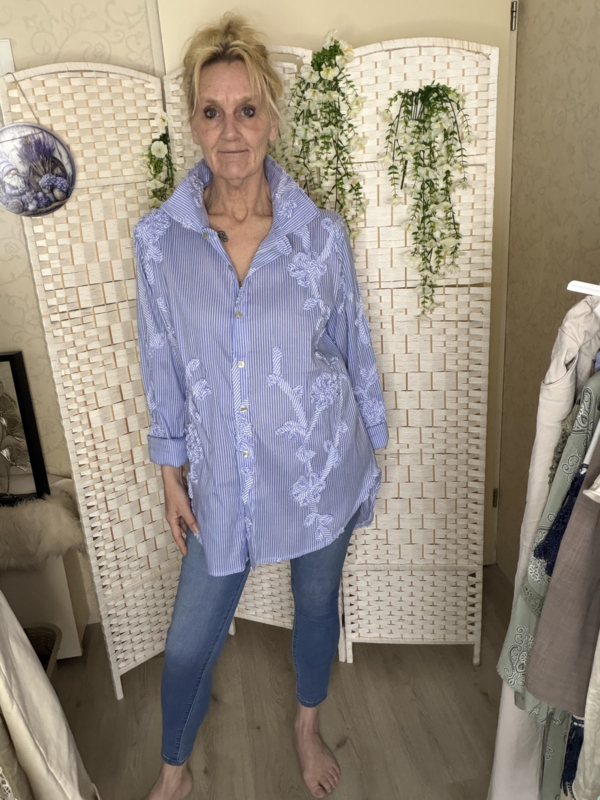 Leuke blouse in het jeans blauw met witte streep en 3 D bloemen 36/44