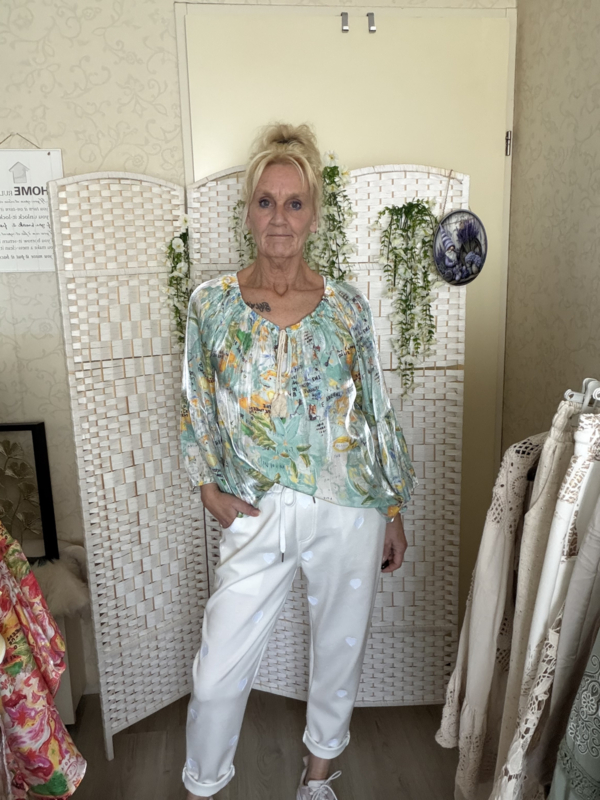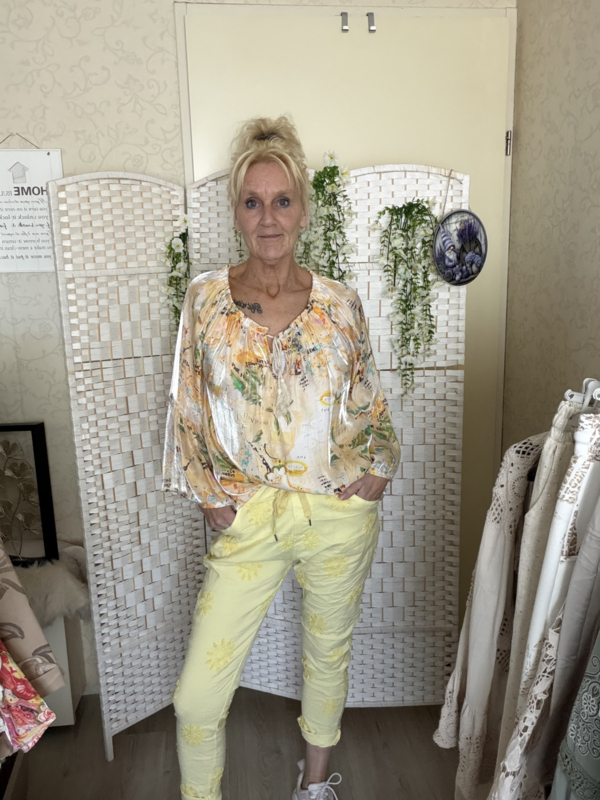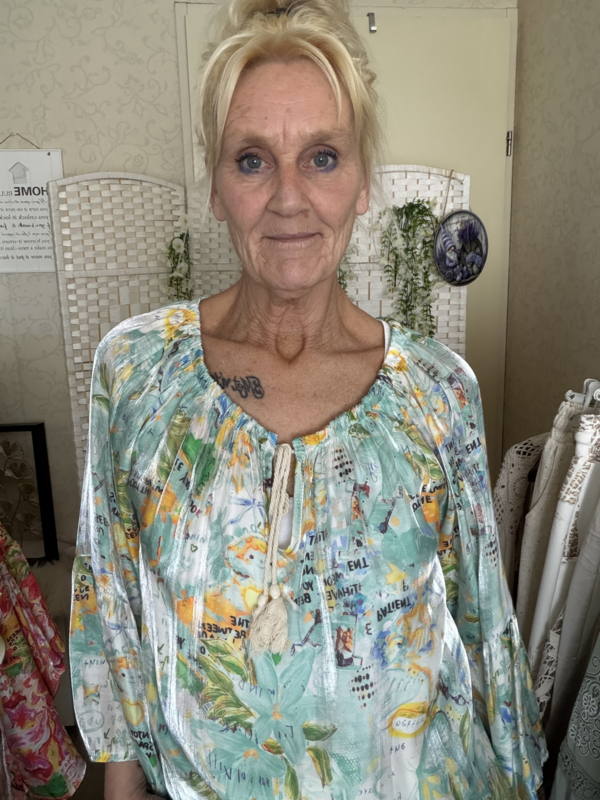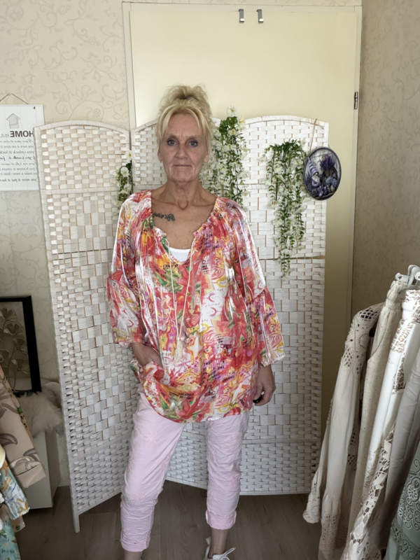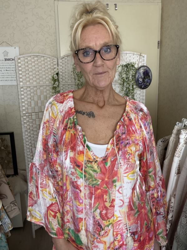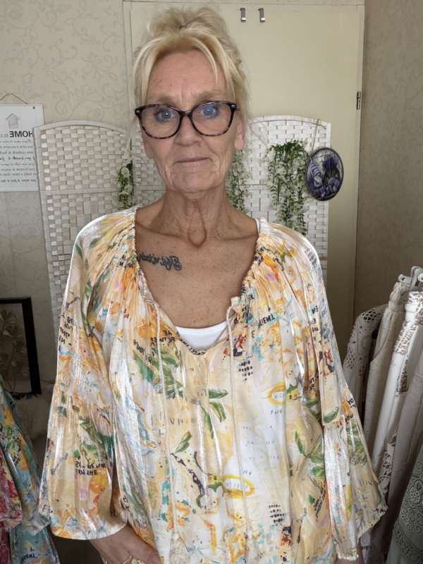 Mooie glans top met trompet mouwtje elastiek lans de hals met 2 klosjes